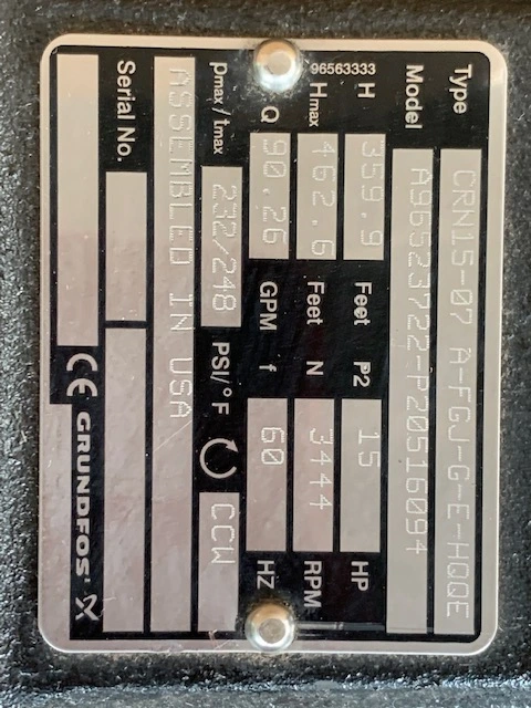 New Storeroom Spare 15hp Grundfos pump, 359.9 feet, 90.26 gpm, 3444 rpm
