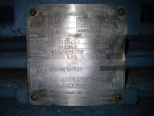 Westinghouse AC Motor 200 hp, 1186 rpm, 575 v, frame 449T
