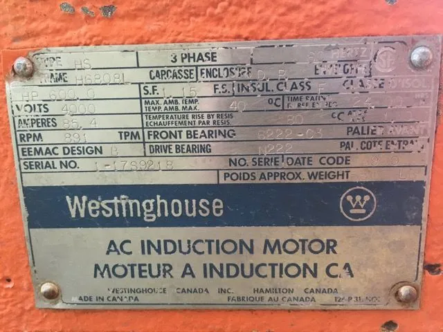 600hp Westinghouse AC motor, type HS, 4000v, 891rpm, encl. DP, frame H6808L