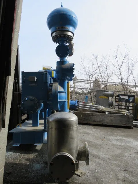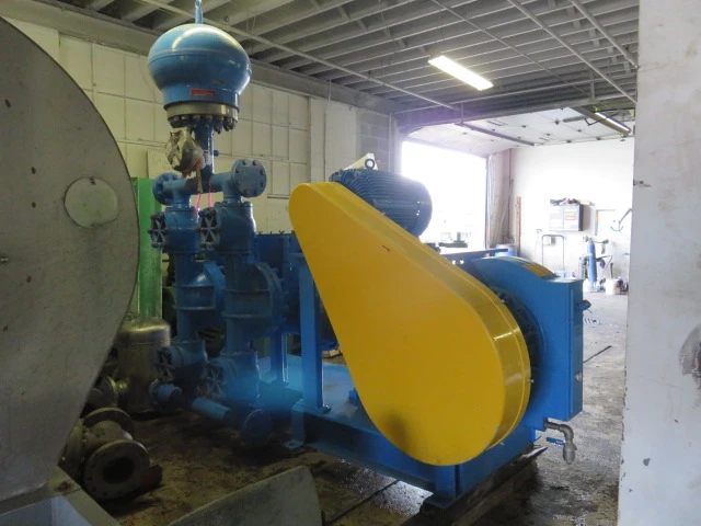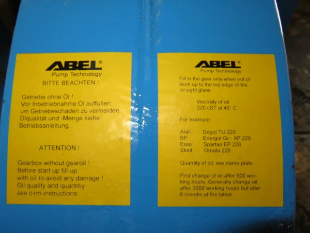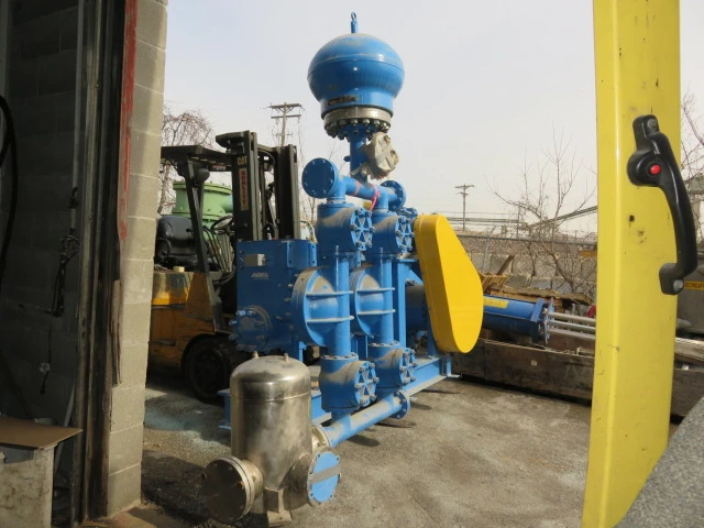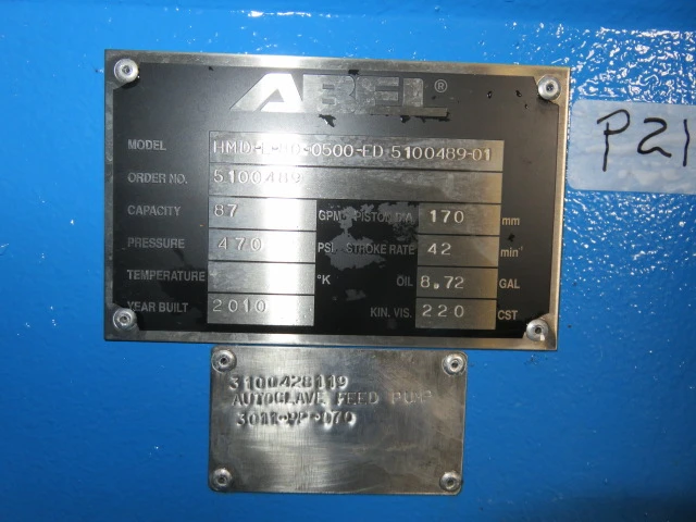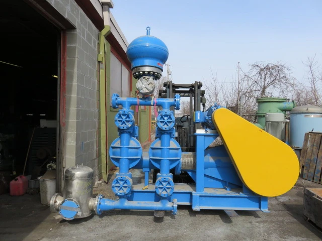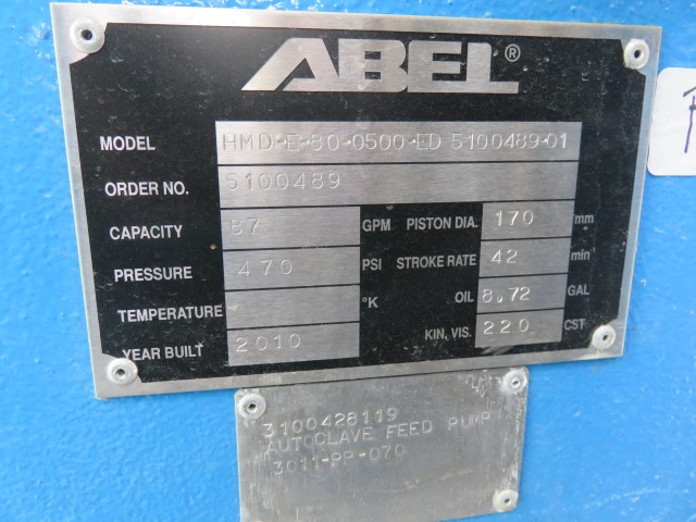 New surplus ABEL hydraulic membrane pump model HMD-E-80-0500-ED-5100-489-01, with base and motor; capacity 87 gpm, piston diameter 170mm, pressure 470 psi, stroke rate 42 min, oil 8.72 gal, kin vis 220 cst, year built 2010