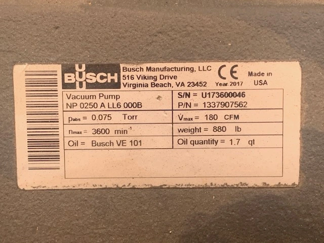Busch Type NP 0250 A LL6 000B / 180 CFM Vacuum Pump, Unused