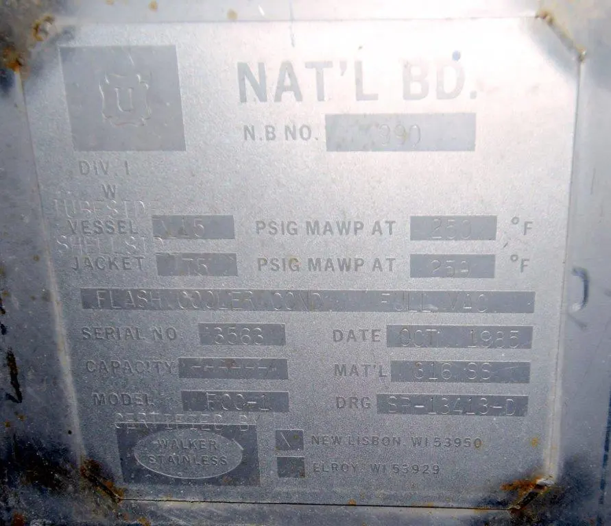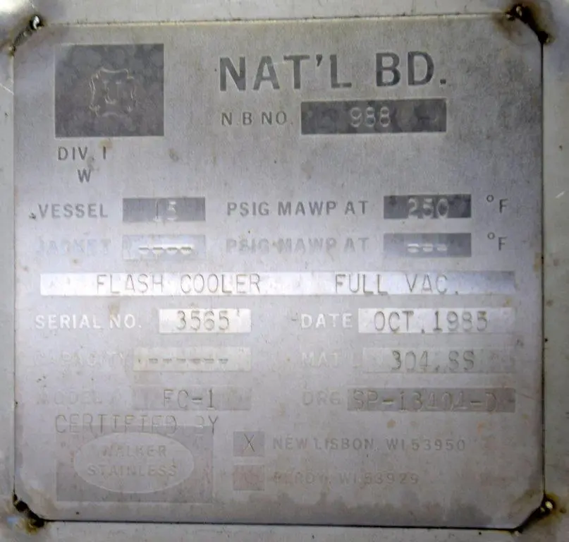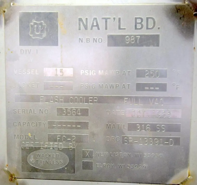 - Used- Dedert Single Effect Evaporator, Consisting Of: (1) Vertical flash cooler, model FC-1, 304 stainless steel. Approximate 40" diameter x 108" tall, internal rated Full Vacuum/15 psi at 250 degrees F., side lug mounts, certified by Walker Stainless, National Board# 988, serial# 3565, built 1985, (1) Vertical flash cooler, model FC-2, 316 stainless steel. Approximate 36" diameter x 108" tall, internal rated Full Vacuum/15 psi at 250 degrees F., side lug mounts, certified by Walker Stainless, National Board# 987, serial# 3564, built 1985, (1) Vertical flash cooler condenser, model FCC-1, 316 stainless steel. Approximate 220 square feet. Approximate 16" diameter x 180" tall, tube side rated Full Vacuum/15 psi at 250 degrees F., shell side rated Full Vacuum/75 psi at 250 degrees F., side lug mounts, certified by Walker Stainless, National Board# 990, serial# 3563, built 1985.