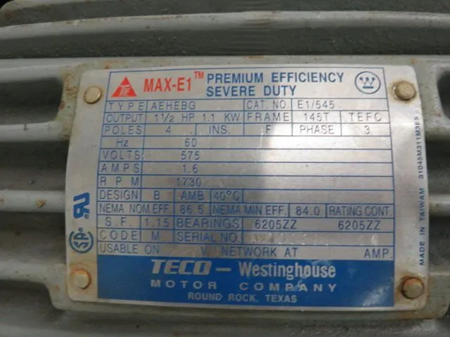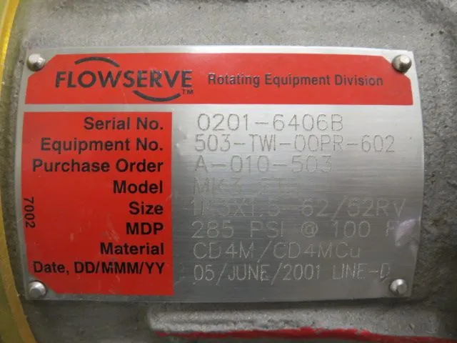 Durco pump size 3×1.5-62/52RV, material CD4M, used condition, 285 psi @ 100F, June 2001, with base and Teco 1.5hp, 575v, 1730 rpm