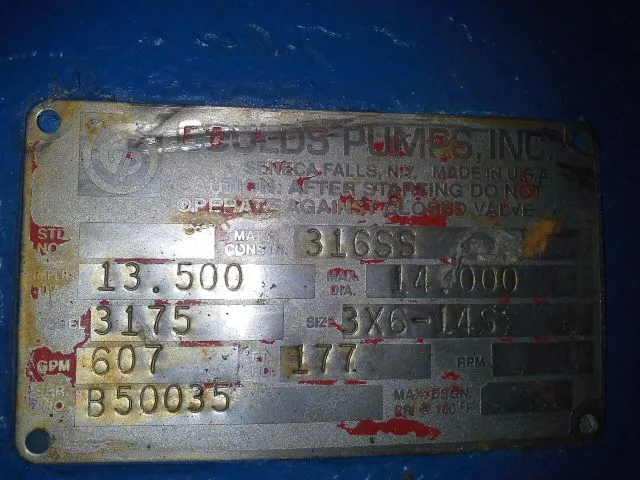Description: Manufacture: GouldsModel: 5500Size: 10x12x25Material: 600 Carbongpm: 6000 ft HD: 80rpm: 880Impeller..Goulds model 3175 Stock Pump size 6×8-22 , material CI/316ss