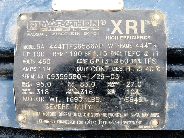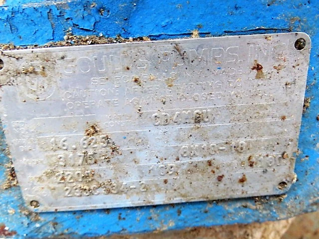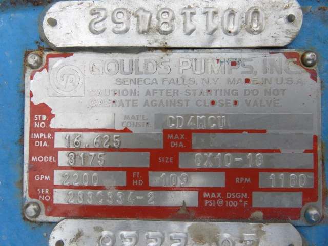 Goulds Stock Pump model 3175 size 8x10x18, material CD4M, 2200gpm, 109ft HD, 1180rpm, with 100hp Marathon XRI AC motor, 460v