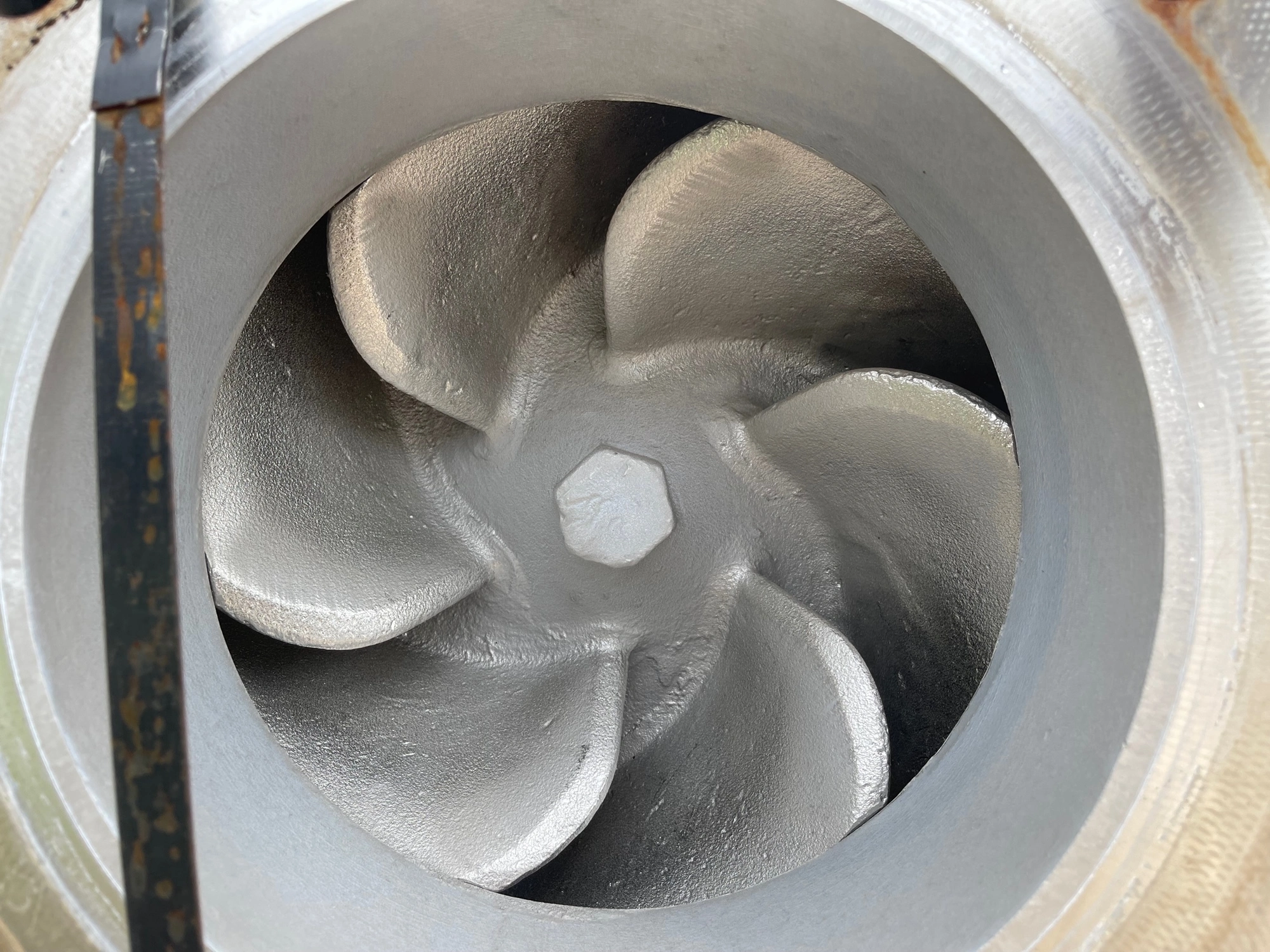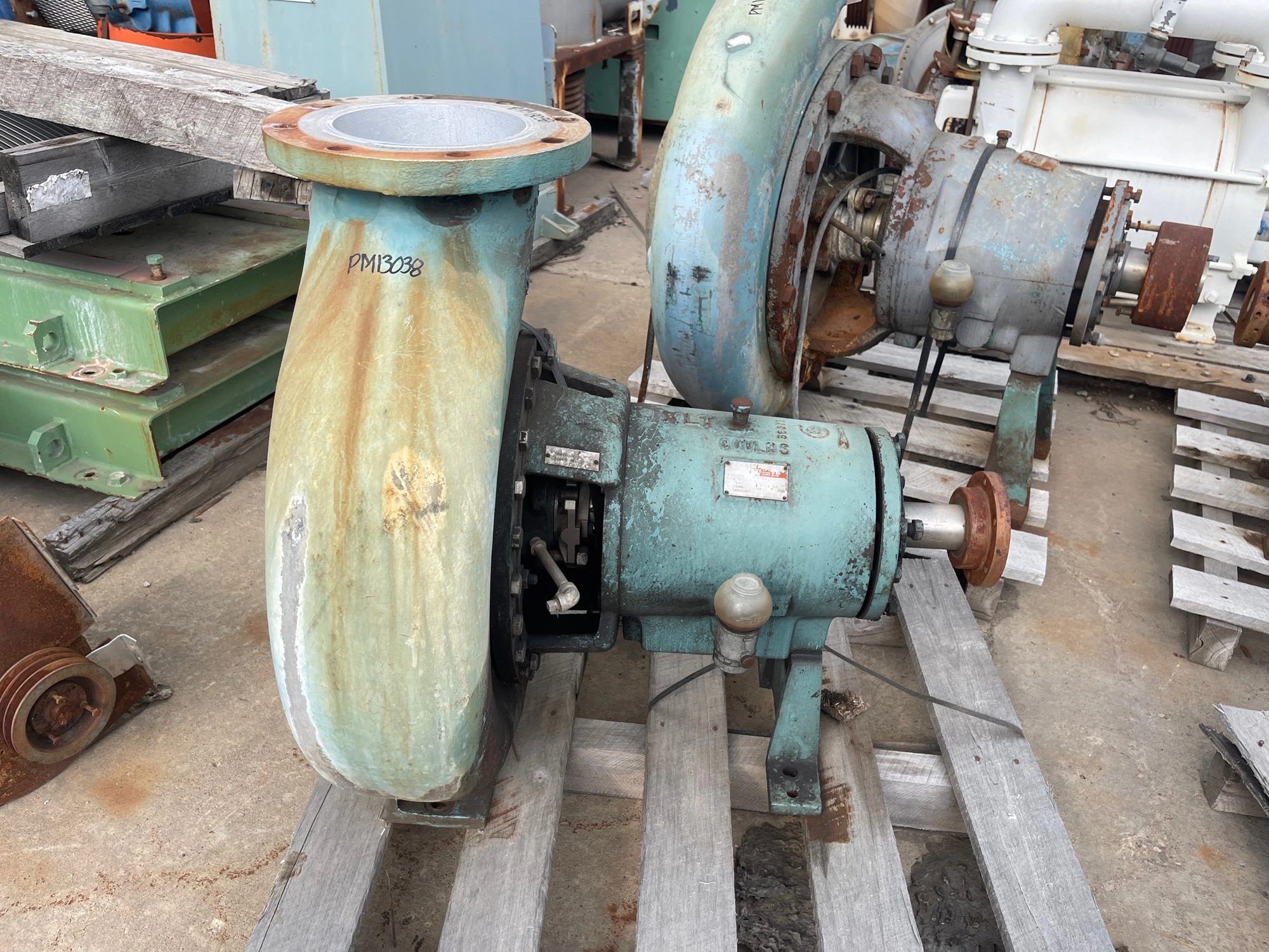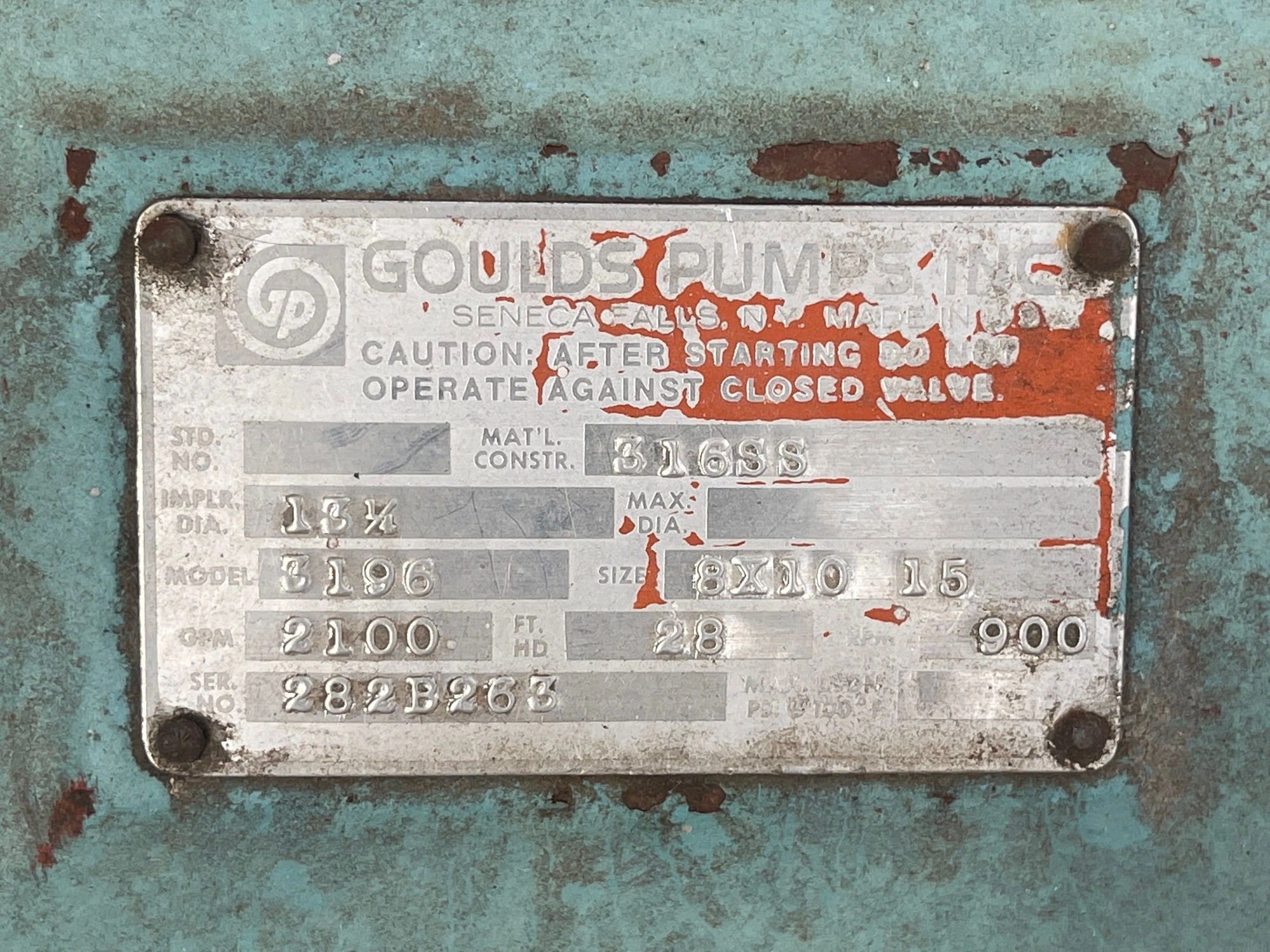 Goulds pump model 3196XLT size 8x10x15, material 316 stainless, 13-1/4″ impeller diameter; 2100 gpm, 28 ft HD, 900 rpm, S/N 282B263