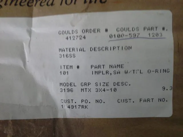 New Impeller for Goulds 3196MTX, size 3x4x10, 5 vane open, 316ss, PN 0100-97-1203