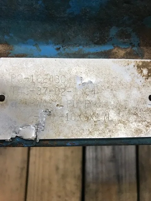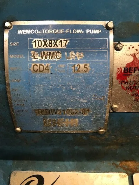 Nice Condition! Wemco Torque Flow Pump, model LWMC LHR, size 8x10x17, material CD4; impeller diameter 12.5″.
